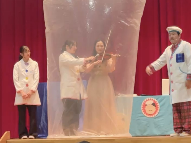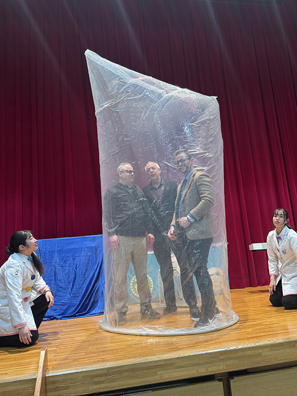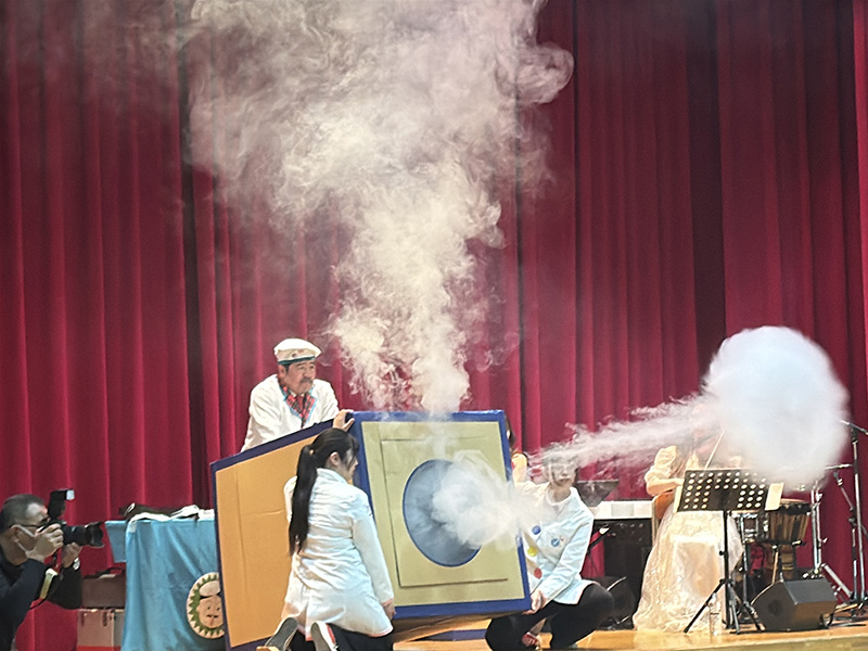 午後のプログラムでは、PTSAの協力により、株式会社サイエンスエンタテイメントのチャーリー西村さんにお越しいただきました。空気の実験や巨大な空気砲(スモークリング)、ヘリウムガスを使った声変わり実験、さらにはライブパフォーマンスまで披露してくださり、会場は大盛り上がり!生徒たちもとても楽しんでいました。